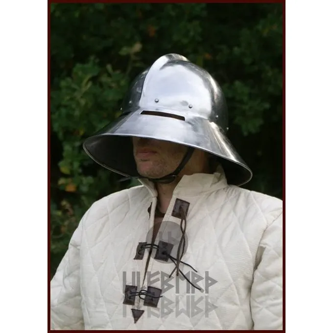Deze ketelhoed is een replica van een laat 14de-vroeg 15de eeuws origineel. Ketelhoeden zoals deze werden tussen de 14de en 15de eeuw in geheel Europa gedragen. Deze ketelhoed (ook wel Kapalinhelm) genoemd is een combinatiehelm van een sallet en ketelhoed. De helm biedt door zijn rand een optimale bescherming tegen projectielen van bovenaf. Daarnaast wordt bij deze helm het gezicht beschermd met een vizier. Wanneer er geen bedreiging was, kon deze helm schuin op het achterhoofd worden geschoven, om zo een volledig gezichtsveld te krijgen. Deze battle-ready helm is gemaakt van 2 mm dik staal.