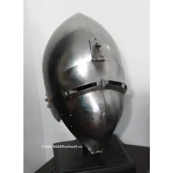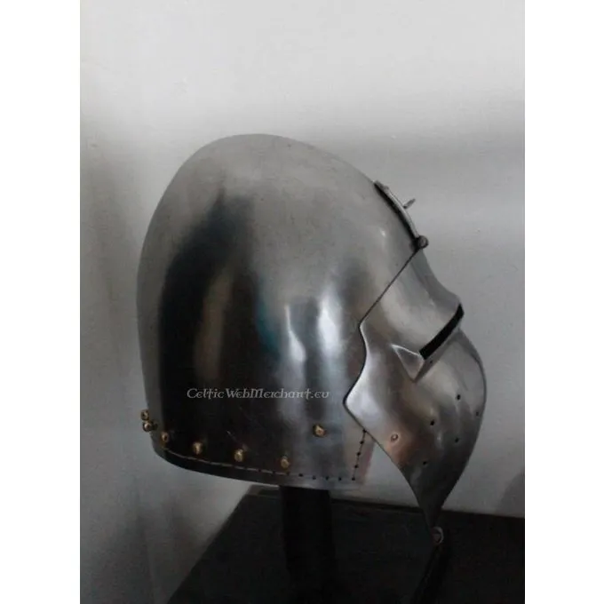 Dit is een volledig gevechtsklare replica van een Duitse, platte bascinet van 2 mm dik staal. Hij is uit twee delen gemaakt die aan elkaar zijn gelast. Het vizier is afneembaar en is van één stuk gemaakt. De helm heeft een leren inleg voor draagcomfort.