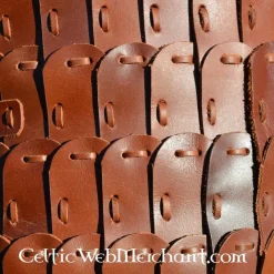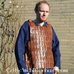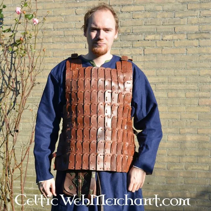 Dit is een reconstructie van een vroegmiddeleeuws, leren lamelpantser. In het pantser zijn ongeveer 220 lamellen met de hand aan elkaar verbonden. Het pantser is geschikt voor een borstomvang van 105 cm. Met behulp van een riempje is hij enigszins op maat te stellen. Om het pantser te verbreden of te verlengen, zijn extra lamellen verkrijgbaar.
